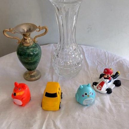 Set med tre mini glasvaser i olika former och storlekar. En vas är rund med grön och vit mönstring, en är oval och enfärgad ljusgrön, och en är rund och klar med dekorativa inslag. Vaserna är tillverkade i glas och kan användas för blomsterarrangemang eller som dekorativa föremål. Inköpta på HM för ca 1 år sen.