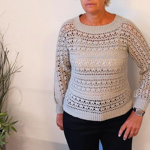 Vacker handstickad tröja i kid-silk mohair. Mjuk, lätt och varm med en luftig fall.Färgen är djupt lila som skiftar fint i ljuset. Modellen är rak med lätt översize känsla och vida armar. Tröjan kan bäras som den är eller med knytband i midjan. Passar S-M , längd-höftlång.Perfekt till vardag eller fest.