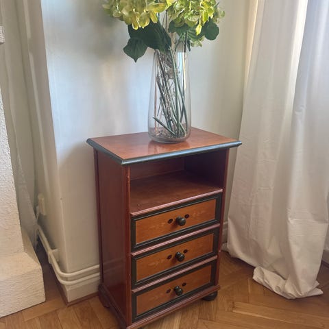 Mörkbrun byrå/skänk/köpmansdisk i trä med 9st lådor.