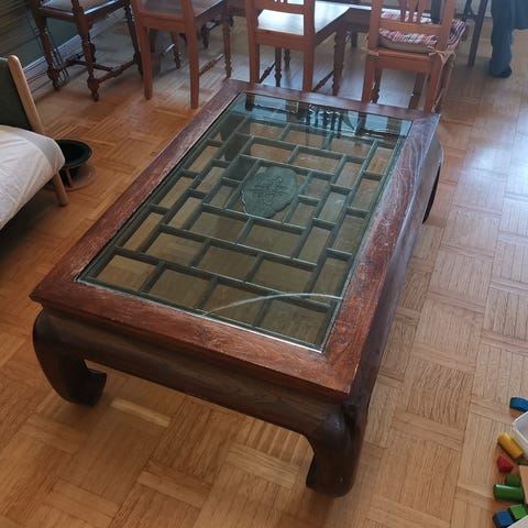 Vackert soffbord eller sideboard med glasskiva och underrede i oljad ek. Bra skick men en del små repor i glasskivan. Kan var 50-60-tal köpt från utförsäljning av Stockholmsmässans möblemang från äldre konferens- och tjänstebostäder för ca 20 år sen. Underredet kan enkelt fällas ihop så kan användas också som extrabord då de kan förvaras i ett förråd mot en vägg. 68 diameter 54 cm hög ( tom glasskivan).