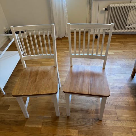 Fem köksstolar i ok skick. Materialet kan skifta lite i färgen beroende på om stolen har använts mer eller mindre.