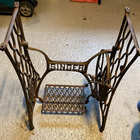 Symaskinsunderede ett träbord och en metallram. Bordet har en mörk träyta med ett fack för symaskinen. Metallramen är svart och stabil, med ett pedalstyrt system för manuell användning.