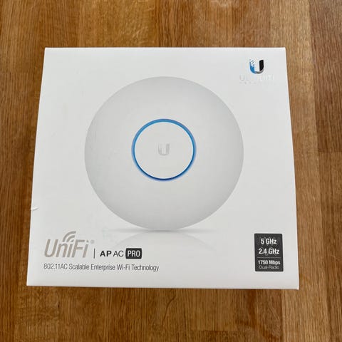 Ubiquiti UniFi Router med tillbehör inklusive strömadapter och monteringsdelar. Produkten är utformad för nätverksanslutning och installation i olika miljöer.