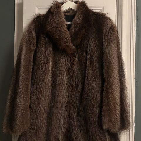 Superfin pälsjacka med flätat skinn på armarna. Väldigt 80-tal. I jättebra skick förutom att sömmen i fodret har lossnat lite nertill, framkommer av bilder. I övrigt är jackan i toppskick. Färgen är en caramell-beige, väldigt fin. Äkta päls vet ej vad för sort. Storlek framgår ej utan är uppskattad utifrån mått. Men se mått för mer detaljer. Mått: över axlarna 50 cm, över bröstet 60 cm, nedre kant 50 cm, längd från axel 72 cm. För referens: Jag på bilden är 1,67 och har storlek S-M.