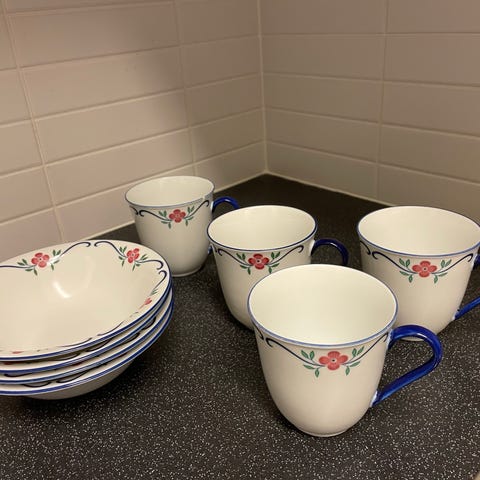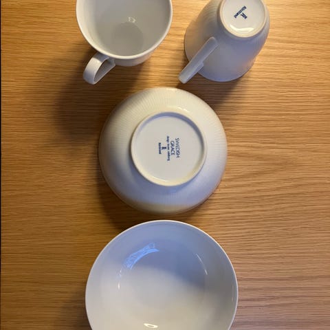 Ett set om 8 koppar/muggar i fyra variationer. Samtliga original från Rörstrand med minst en specialutgåva.