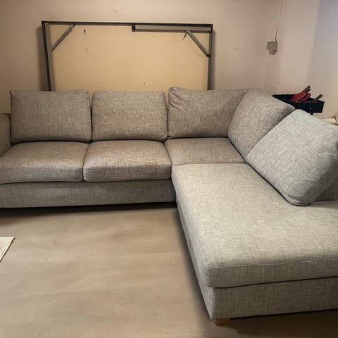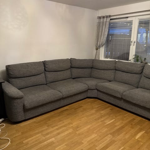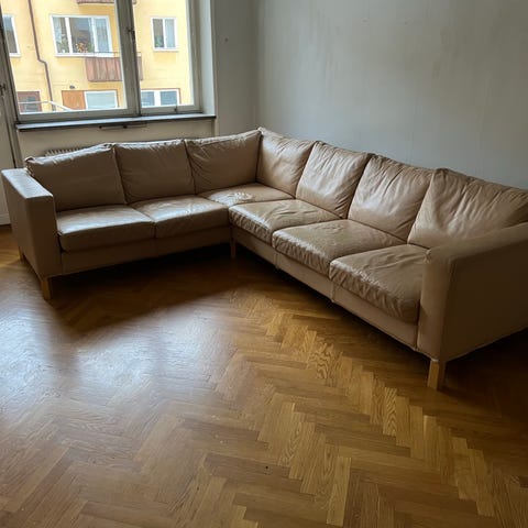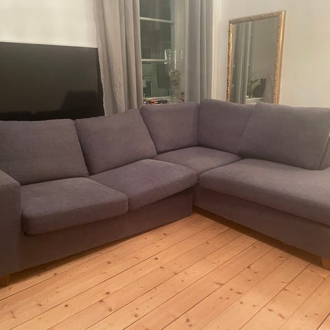 Röd hörnsoffa i använt men bra skick. Inga synliga skador. Mått 248/248 cm bredd/längd. Både dynfodralen och soff fodralet avtagbara/tvättbara. Stommen är i 3 delar, hörnet och 2st sidor.