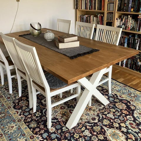 Stolarna vita färg flagnar på vissa ställen. Sittdynorna går enkelt att ta av om man vill ha ett annat tyg.