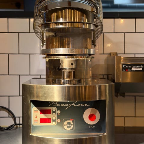 Pressen är utformad för att skapa en liten fördjupning i burgaren, vilket ger platta och jämnt tillagade hamburgare. Kan användas för både 120 g och 220 g burgare.
