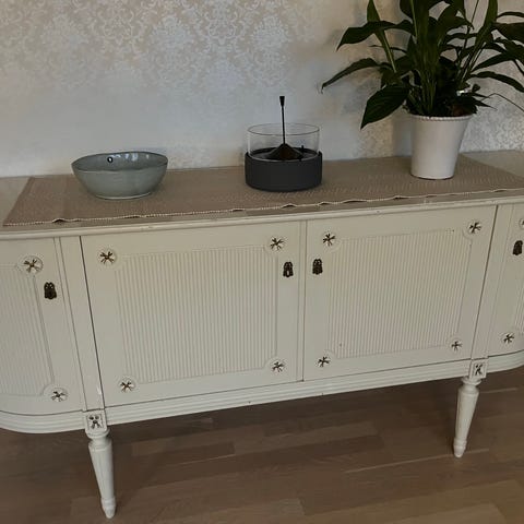Säljer en skänk/hallbyrå med tillhörande spegel, nyrenoverad i en elegant och tidlös stil. Formen är klassisk, lantlig stil med gustavianskt inspirerade linjer (dock nyare tillverkning)