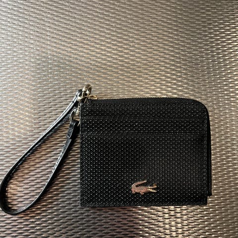 Lacoste plånbok i läder för dam – helt ny och oanvänd. Plånboken har flera kortfack samt ett fack med dragkedja för mynt eller små föremål. Den har en avtagbar handledsrem och stängs med dragkedja. Färgen är mörkblå med ljusare insida.