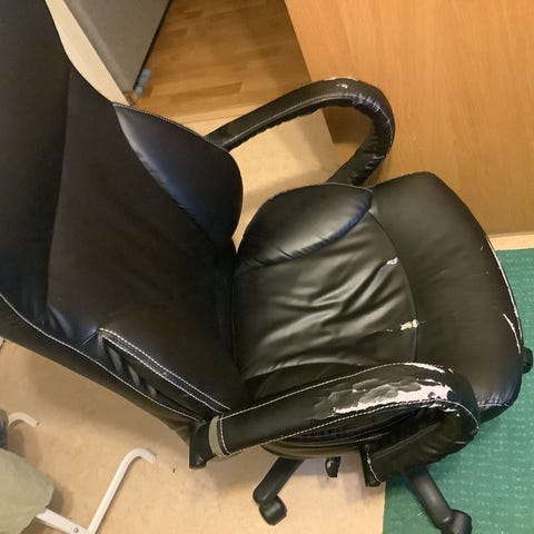 Inköpt för över 2000kr men har skador på tyget (nött) på sittdynan och på armstöden. Det går att köpa nya armstöd till den om man vill byta ut dom.