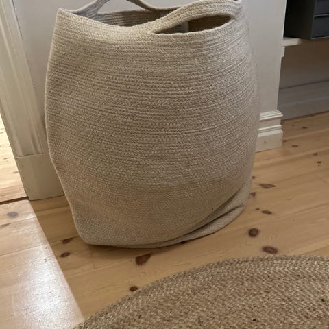 Helt ny tvättkorg i vattenhyacint från Dixie. Aldrig använd utan köpte två där jag endast behövde den mindre. Mått på denna är : höjd 60cm, diameter 42 cm. Medföljer tvättpåse i bomull.