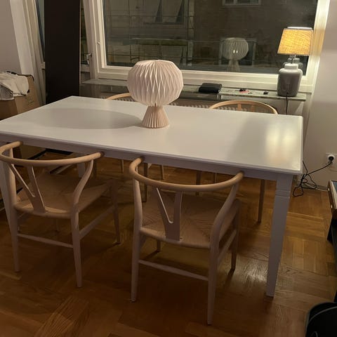 Snyggt vitt matbord med pelarfot och 6 matchande svarta stolar. Plats för 6–8 personer, stabilt och stilrent.