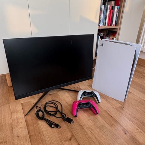 Playstation 5 spelkonsol. Konsolen har en vit och svart design och levereras med två trådlösa handkontroller i svart och vitt.