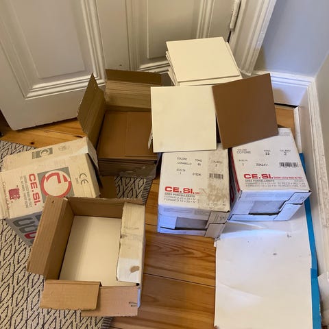 Köpta för ca 1000kr/kvm men säljes för 500kr/kvm eller enkelt räknat 500kr per paket så allt för 6000kr. Vill man ha med en 120*60 grön platta (se bild på hur vi ramade in som en tavla i vårt badrum) får man allt för 6200kr.
