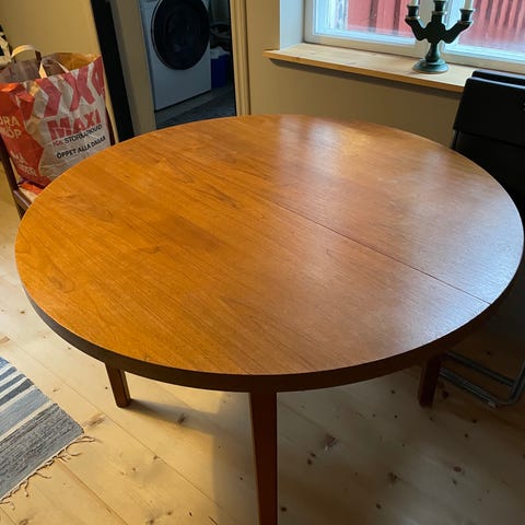 Kvalitetsbord i teak. 120 cm i diameter. Det finns 2 iläggsskivor om 50 cm styck som gör att bordet kan bli avlångt och 170 eller 220 cm långt. Fint skick utan repor, hack eller missfärgningar. Tillverkat av Skaraborgs möbelindustri i Tibro under 60-talet.
