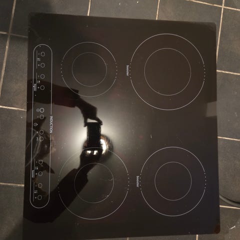 Electrolux Induktionshäll Husqvarna med fyra kokzoner. Glaskeramisk yta med touchkontroller för justering av värme. Hällens design är svart med tydliga markeringar för varje kokzon. Anslutningskabel synlig på sidan. Passar för installation i kök med induktionskompatibla kokkärl.