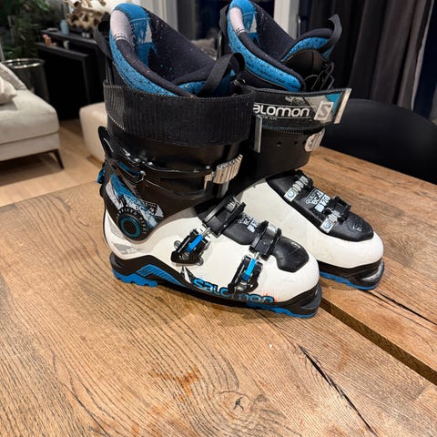 Salomon X Max 120 skidpjäxor i svart och vitt, storlek 42. Pjäxorna är utrustade med flera spännen för justerbar passform och en robust sula för bra grepp. De är designade för alpinskidåkning och erbjuder stöd och komfort under användning.