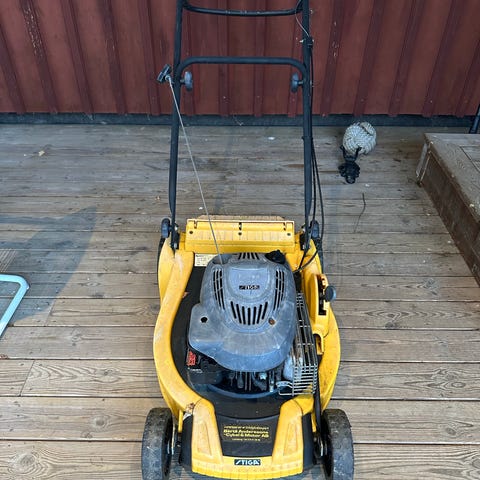 Scoop gräsklippare åkbar i gul färg. Maskinen är utformad för att underlätta gräsklippning med åkbar funktion. Dragsnöret gick sönder i somras och vet inte hur man gör så och orkar inte lägga ner tid på den, men gick jätte bra innan .