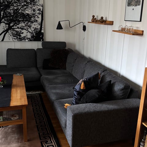 Grått tyg m tvättbara kuddar o ben av ek.