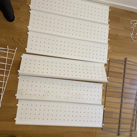 Hyllsystem som jag tror vi köpte på Bauhaus för flera år sen. Gavlarna har aldrig använts, hyllplanen är gott begagnat skick.