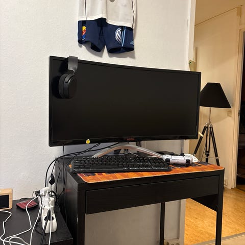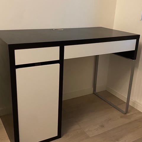 Skrivbordet är designat med en låda för förvaring och en öppen hylla som hjälper till att hålla ordning på tillbehör och småsaker. En smart detalj är kabelhanteringen på baksidan som döljer sladdar och samtidigt tillåter luftcirkulation runt elektronisk utrustning. Nypris på IKEA 995 kr.