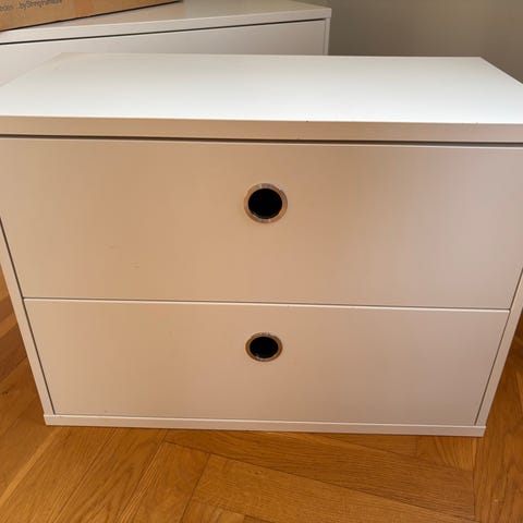String Möbel Nils Strinning förvaringsenhet i vit färg. Består av två lådor och metallstativ i vitt.