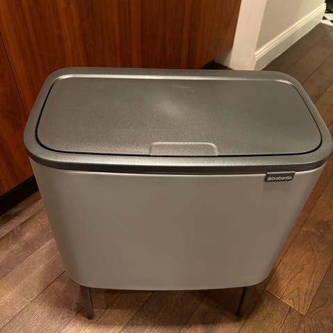 Praktisk elegant soptunna i stål. Sparsamt använd för papprrsinsamling. Luktfri och utan repor. Ny pris 2300 kr.