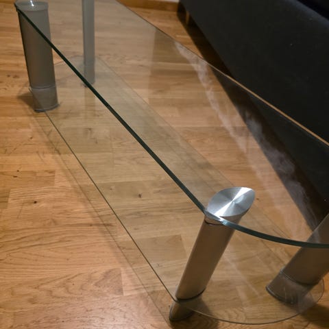 Två glas bord vita med en glas skiva det som ligger på borden följer ej med