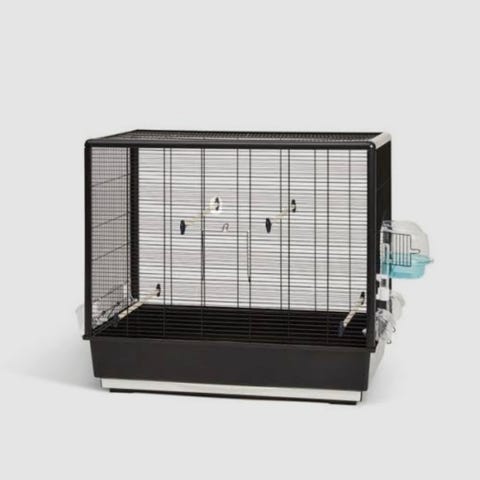 Fågelbur i svart metall med flera träpinnar och tillbehör för fåglar. Burens konstruktion består av metallstänger och har en botten som kan tas bort för rengöring. Passar för små till medelstora fåglar.