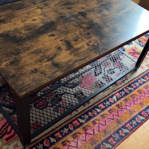 Fyrkantigt träbord med brun yta. Bordet har en enkel design och är lämpligt för olika rum och användningsområden. Underredet är tillverkat i trä och bordsskivan har en slät finish.