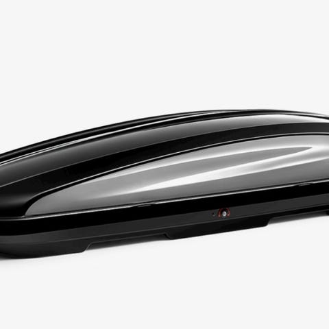 BMW takbox i svart och silver. Takboxen är designad för att monteras på bilens takräcken och används för att öka lastkapaciteten vid transport av bagage eller utrustning.