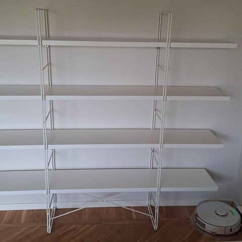 Vit benställning i metall och vita laminerade hyllplan.