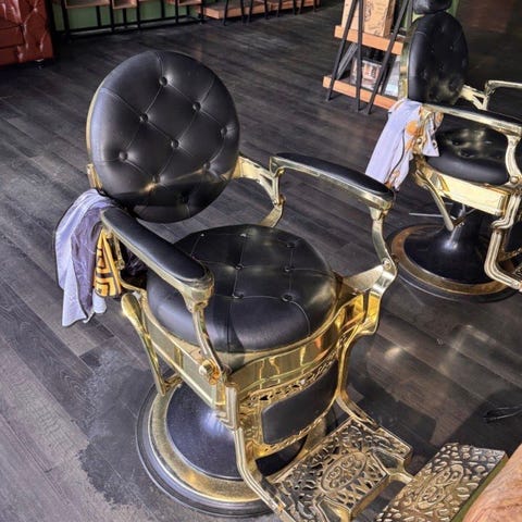 Barbershop med inredning och utrustning inklusive frisörstolar, speglar, arbetsytor och dekorativa element. Lokalen har stora fönster med bågformade överdelar och en klassisk svartvit rutigt golv. Passar för verksamhet inom barbering och hårvård.