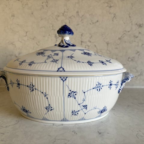 Jättefin terrin för soppa med praktisk hållare för soppsleven. Knappt använd och förvarad i vitrinskåp.