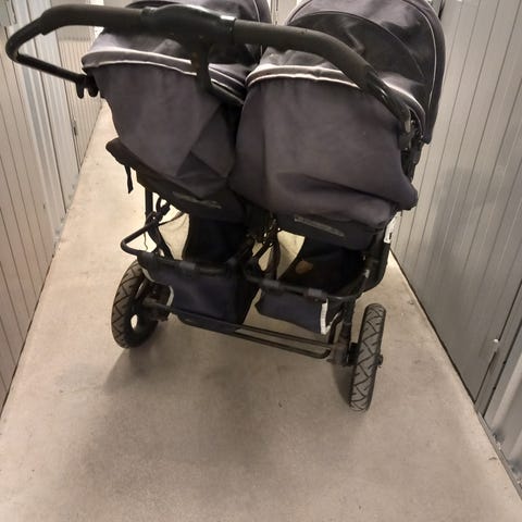Twistshake syskonvagn i beige färg. Vagnen är designad för två barn med separata sittplatser och har säkerhetsbågar fram. Den är utrustad med solskydd och förvaringskorgar under varje sittplats. Medföljer massor av tillbehör såsom paraply, nackstöd, regnskydd mm