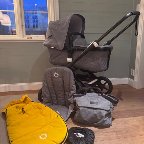 Nu säljer vi vår älskade Bugaboo barnvagn i grey melange tyg. Svart ram och hjul samt den ovanliga korgen i samma tyg som sittdelen. Köpt 2020 och originalkvitto finns. Väl omhändertagen och har alltid stått inne på natten. Vi har bytt läderhandtagen till nya i original i läder för tre år sedan. Service gjord på vagnen för två år sedan hos Bonti som är certifierade service företag för Bugaboo. Ramen stött på ett ställe, se bild. I övrigt i fint skick!