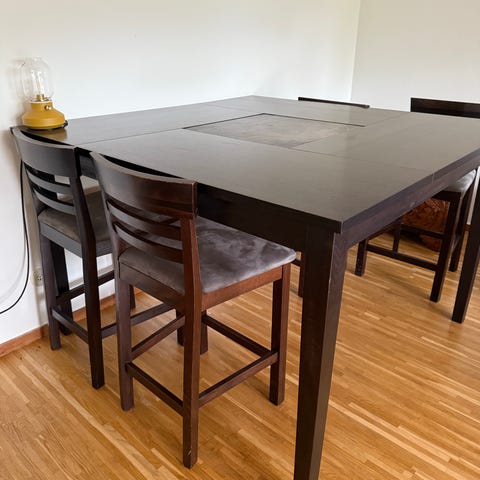 Säljer ett runt matbord/barbord från Bolia i vitoljad ek med plats för tre personer, storleken är 80 cm i diameter, höjden är cirka 103 cm, tre stycken barpallar i ek, höjd 72 cm, mycket smidigt mått om ytan är begränsad men man ändå vill ha möjlighet att sitta tre personer, kit med vitolja följer med. Inköpta nya för cirka tre år sen, finns på Gärdet, nypris var strax under 10,000:-, säljer nu för 2,500:- eller bud.