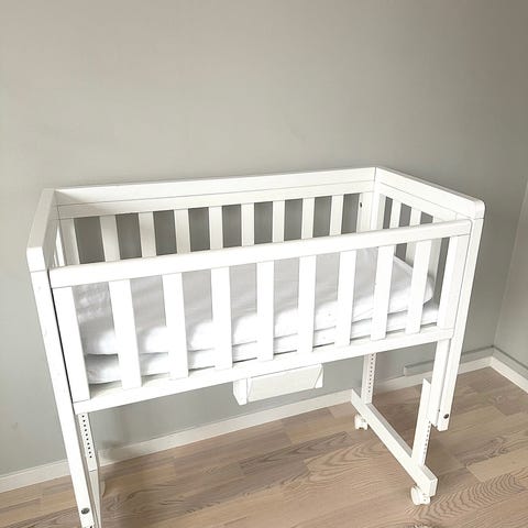 I stort sett oanvänd bedside crib från Troll Nursery inkl madrass och spjälsängsskydd!