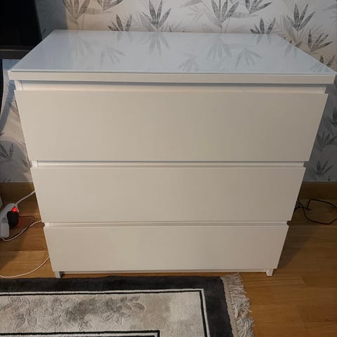 IKEA Carl Malmsten TV-bänk i vitt utförande. Möbeln har två lådor och öppna hyllor för förvaring och placering av mediautrustning. Designad för att passa i vardagsrum eller liknande utrymmen.