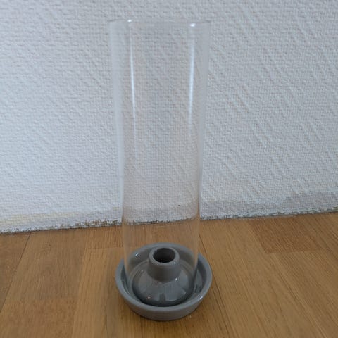 ERNST ljuslykta i glas med vit botten. Transparent glasbehållare med vit rund bas och läderrem. Gummiskydden som glaset står på har gulnat men går att byta ut, i övrigt bra skick.