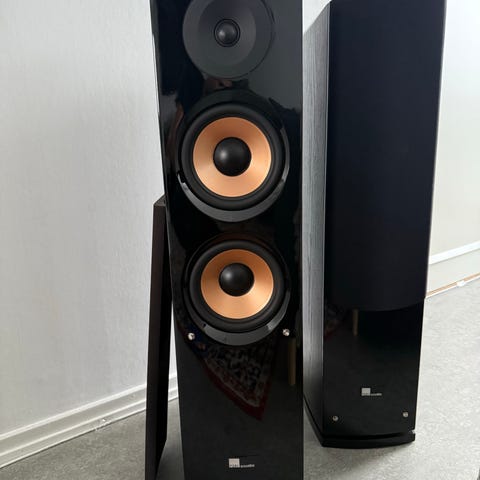 Slank design som tar lite plats, stadiga golvplattor ger stabil placering. Enkla att koppla in med standard högtalarkabel.