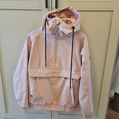 Snowboard /skidjacka av märket Picture Organic Clothing. Det är en anorak-stil jacka med en kort dragkedja framtill och en stor magficka, en mindre ficka med dragkedja på bröstet och ficka för liftkortet på ärmen.