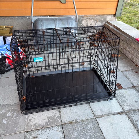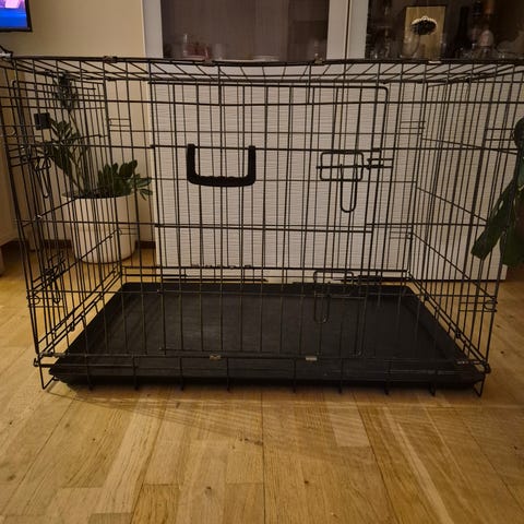Svart metallbur för hund med gallerdesign och öppningsbara luckor. Mått 90x75x85 cm (BxDxH).