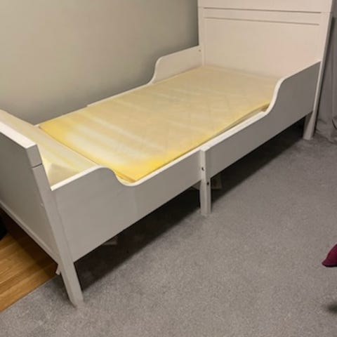 80×200 cm, Ikea Minnen växasäng (gamla modellen) med tillhörande madrass.