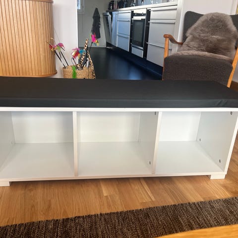 IKEA Mediahylla i vit färg med två öppna fack. Möbeln är tillverkad av trä och har en enkel och funktionell design. Passar för förvaring och placering av TV och mediaenheter.