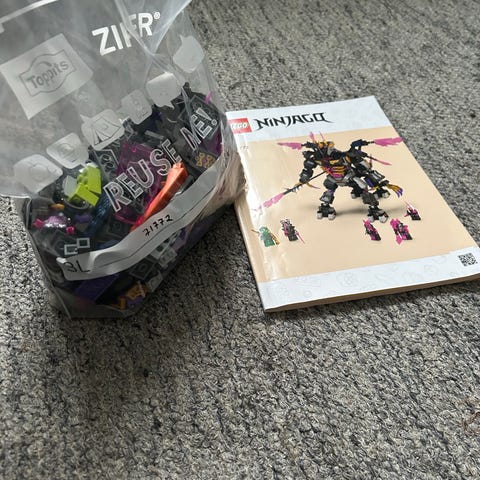 LEGO NINJAGO, komplett med alla minifigurer och alla bitar, inga reservbitar. Den enda saknade biten, synlig på bild 5, är den svarta som håller rep och tråd till spjutet. Annars finns allt.