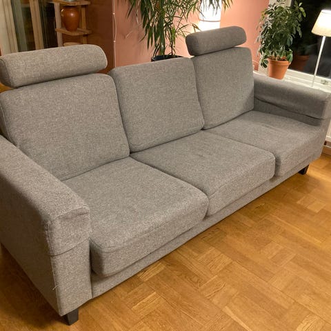 Grå soffa och två matchande fåtöljer i gott skick