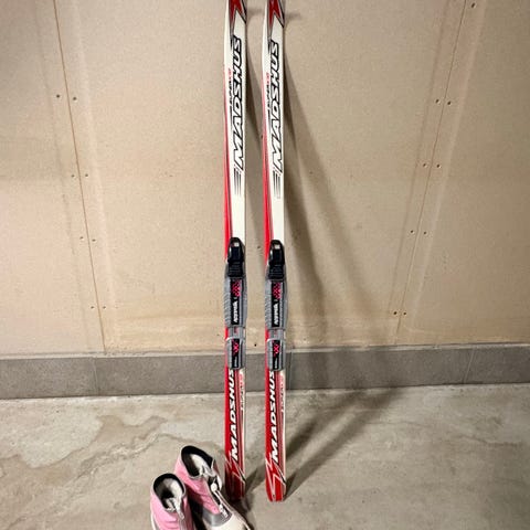 1/ Fischer World Cup Classic skidor med Rottefella bindningar. Längd 137 cm. Väl använda. 100kr