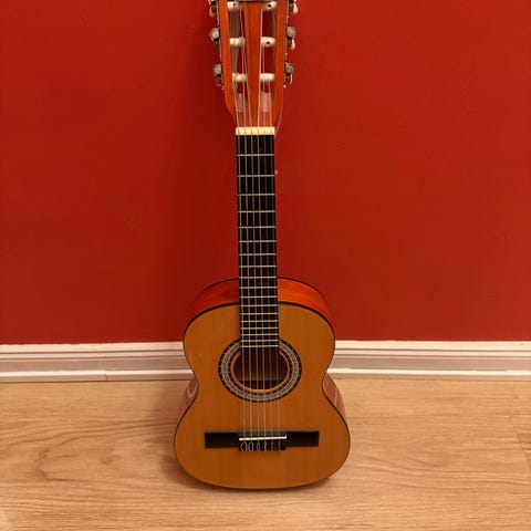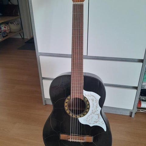 Gitarren är i bra skick med några små märken men har använts sparsamt. Det ingår stöd och fodral (vadderat med ryggsäcksremmar).
